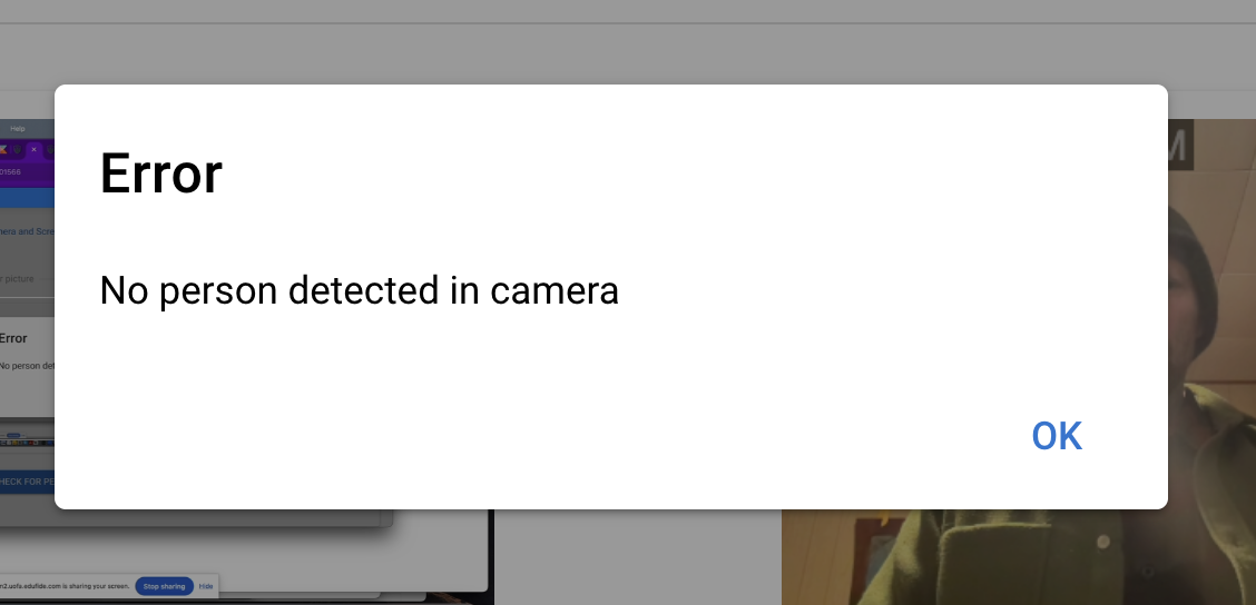 Chrome must be configured to be full screen without the camera notch. To do this: make sure Google Chrome is completely shut down by selecting "Quit" from under the file menu; go to your Applications folder (under the Go menu in finder or pressing CMD-Shift-A); find Google Chrome; right-click on the app icon and select "get info"; check the setting "Scale to fit below built-in camera."; then relaunch and restart the SEM setup process. If SEM has been setup correctly and appears to function correctly but then crashes when ExamLock is launched, students must ensure they are using Google Chrome. SEM will function with MS Edge but not if used in combination with ExamLock. Ensure that you have a stable internet connection. If you are out of region and require a VPN service, contact IST through the U of A Service Portal available on the Staff Service Centre and the Student Service Centre webpages. If you are using a VPN service, you may try disabling it. - Error "No person detected in camera": On first launch of the SEM V2 Chrome app, this error will appear immediately after sharing your screen. Students can safely ignore it and click OK to close the alert and then CHECK FOR PERSON IN CAMERA to continue the monitoring validation.