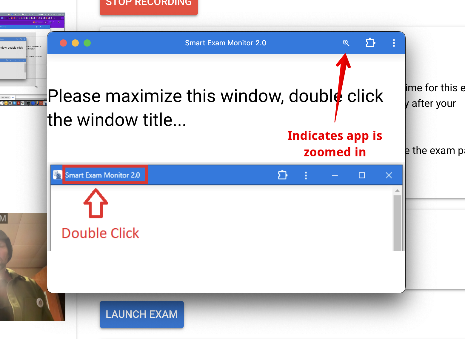 - Maximize window appears to function but does not launch exam: Users who magnify or increase the zoom in their Chrome SEM V2 app will not be able launch their exam. Double-clicking the app header will fill the window full screen but they will not be redirected to the exam start up page. Users can tell if they are zoomed in if they see a magnifying glass icon near the top right and hovering over the magnifying glass will show a value other than 100%: