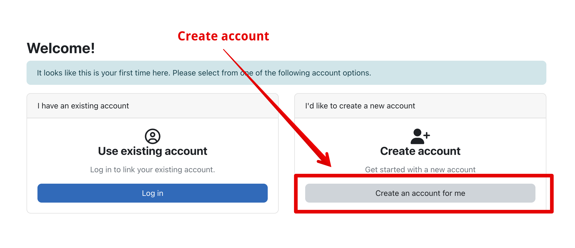 If it is your first time accessing a STACK assessment in ANY of your courses, you may be asked to create an account. This process should occur automatically but sometimes does not. If you do already have an account, this screen will not appear at all and you can proceed directly to begin your assessment (see below.) If this DOES occur, click the Create an account for me button in the right half of the screen: