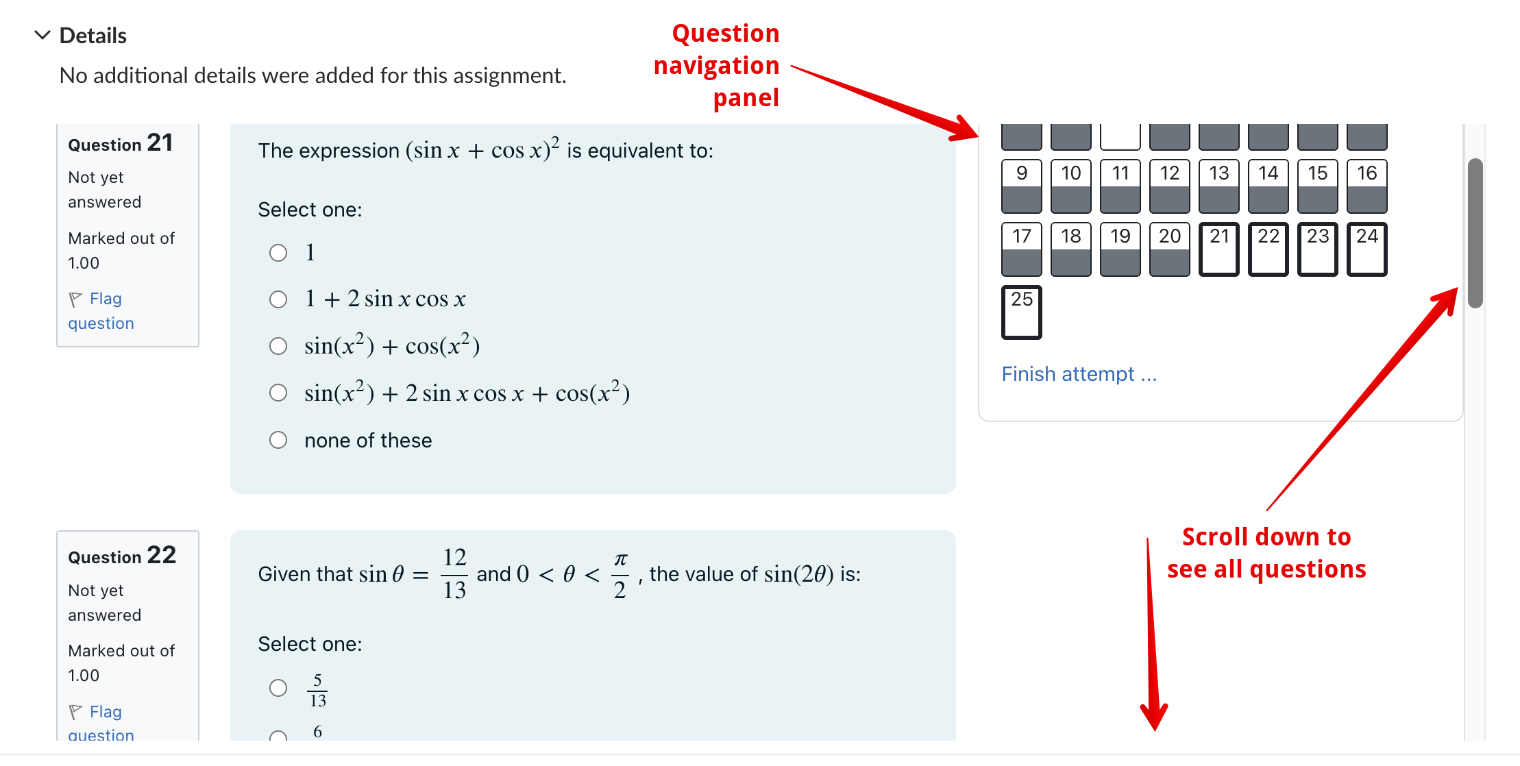 Taking STACK AssessmentsThe STACK assessment engine shows the questions in the center panel with a quiz navigation panel at the top right. You may need to scroll down the page to see all the questions: