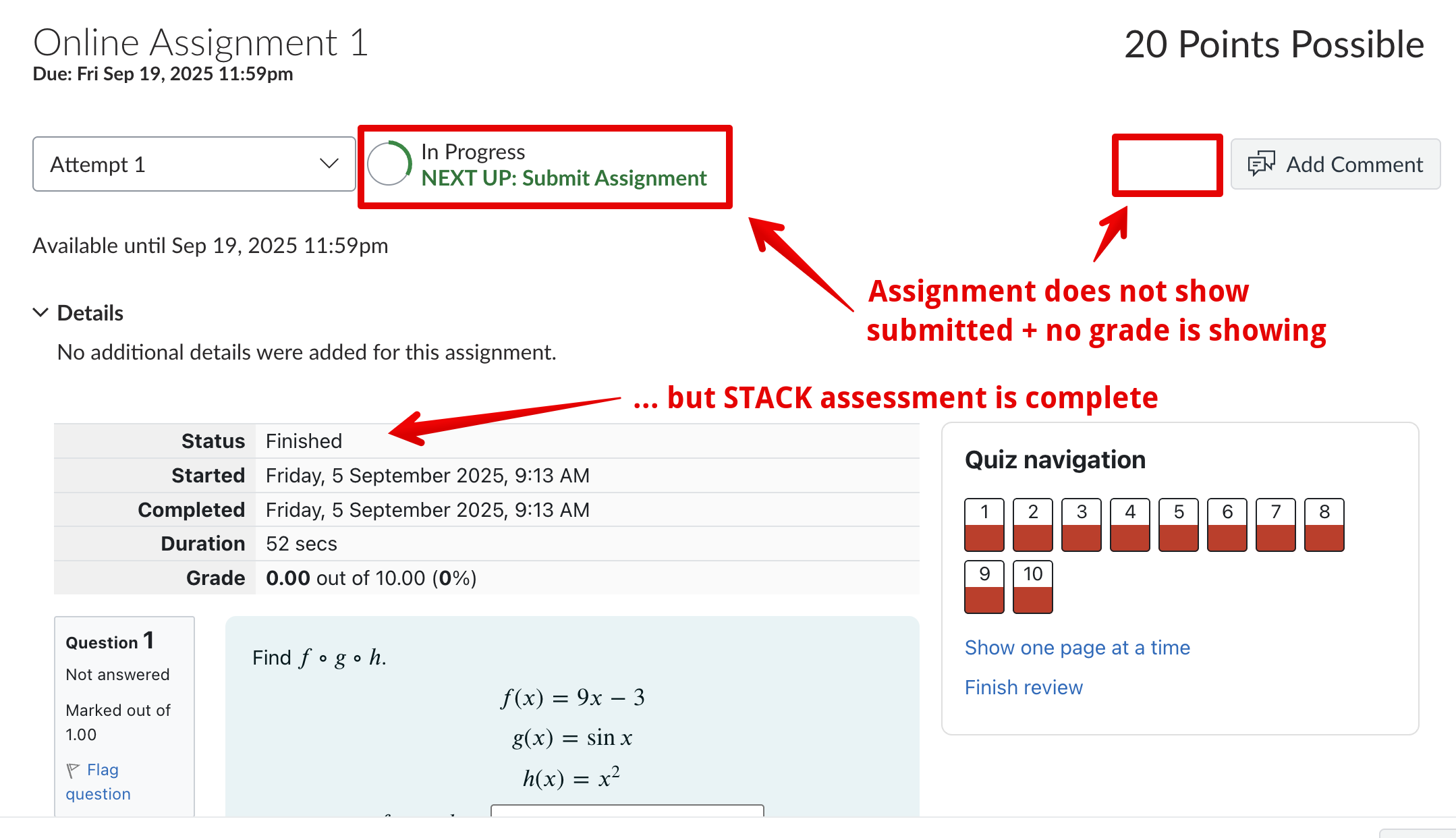 There is a sync process that sends grades from the STACK assessment server that must run before an assignment is marked as Submitted. The timing of this process depends on server load and can take up to an hour but once the grade synchronization is complete, the assignment will show as submitted and the score will appear at the top right: