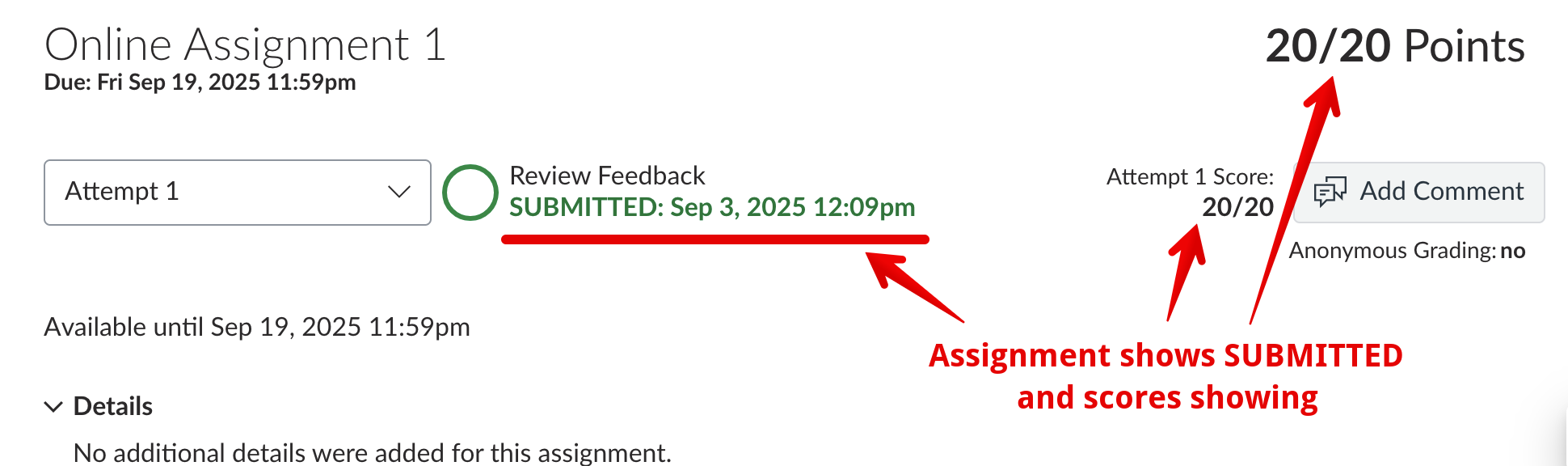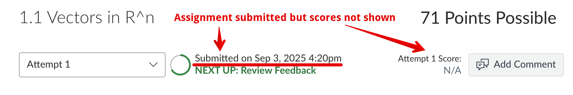 Reviewing Attempts and GradesImmediately after you submit, you may see your score directly in the STACK assessment, depending on the configuration. Note however that you will not see your score posted in your Canvas gradebook immediately nor see a submission notification on the canvas assignment: