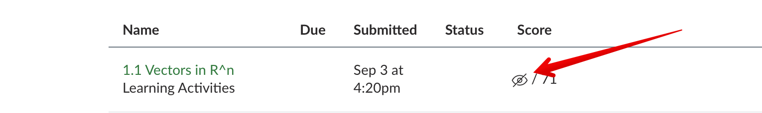 Your Canvas instructor may additionally post the grades at a later date, for example if there needs to be manual marking, any review of the questions, or especially if is a higher stakes exam or assignment and the grade release needs to wait until all students have completed it. In this case the assignment will show as submitted but the grades will not be displayed, instead showing N/A in the assignment and a closed eyeball in the gradebook: