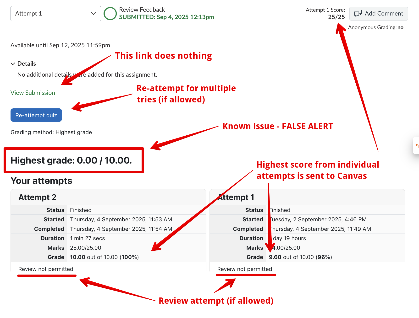 For most homework assignments, when you re-access the STACK quiz after submitting, you will see your assessment score(s), the option to re-try the quiz (if allowed), review the attempts (if allowed), and the score posted to Canvas: