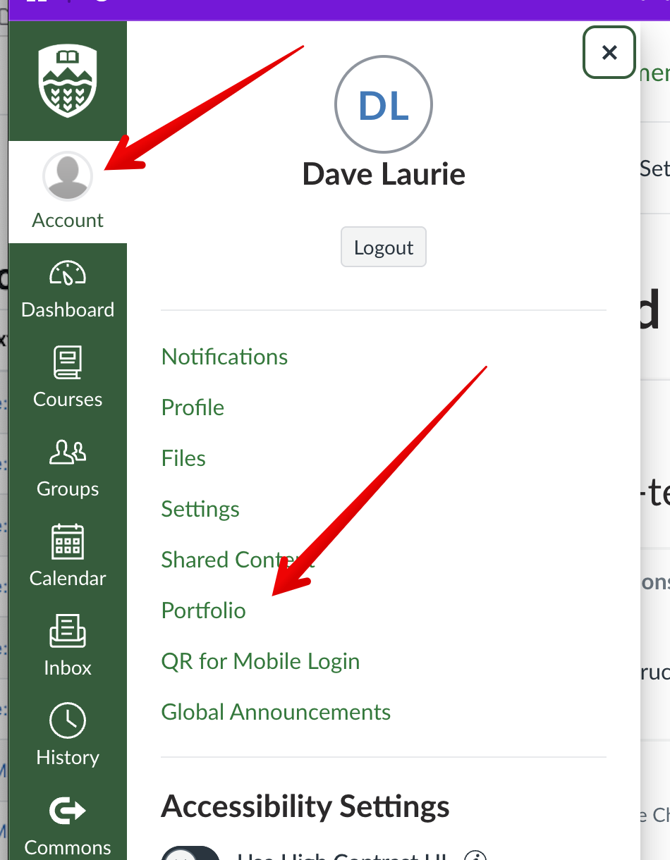 Accessing Canvas PortfoliosPortfolios are accessed inside Canvas through user's Account menus: